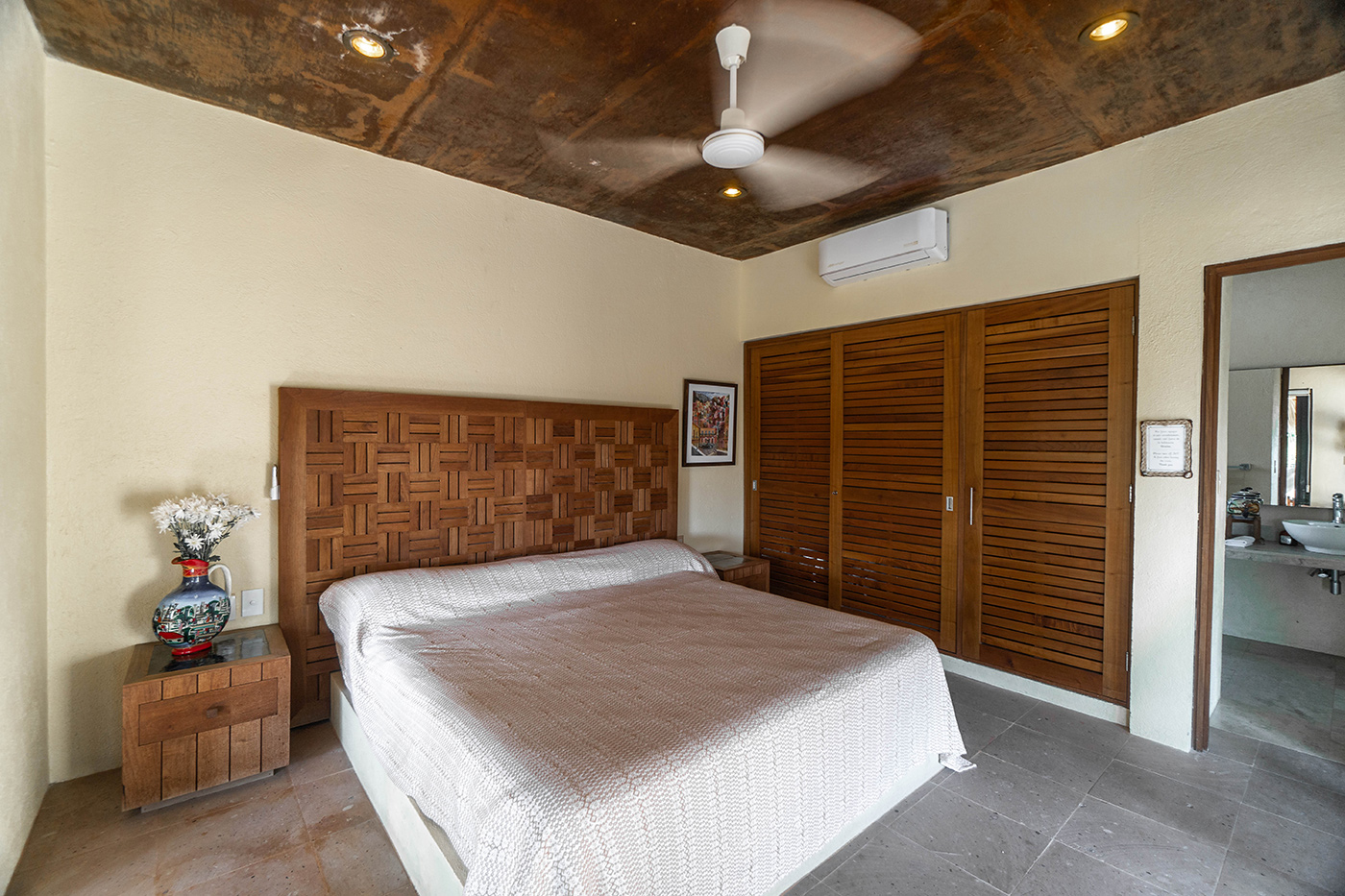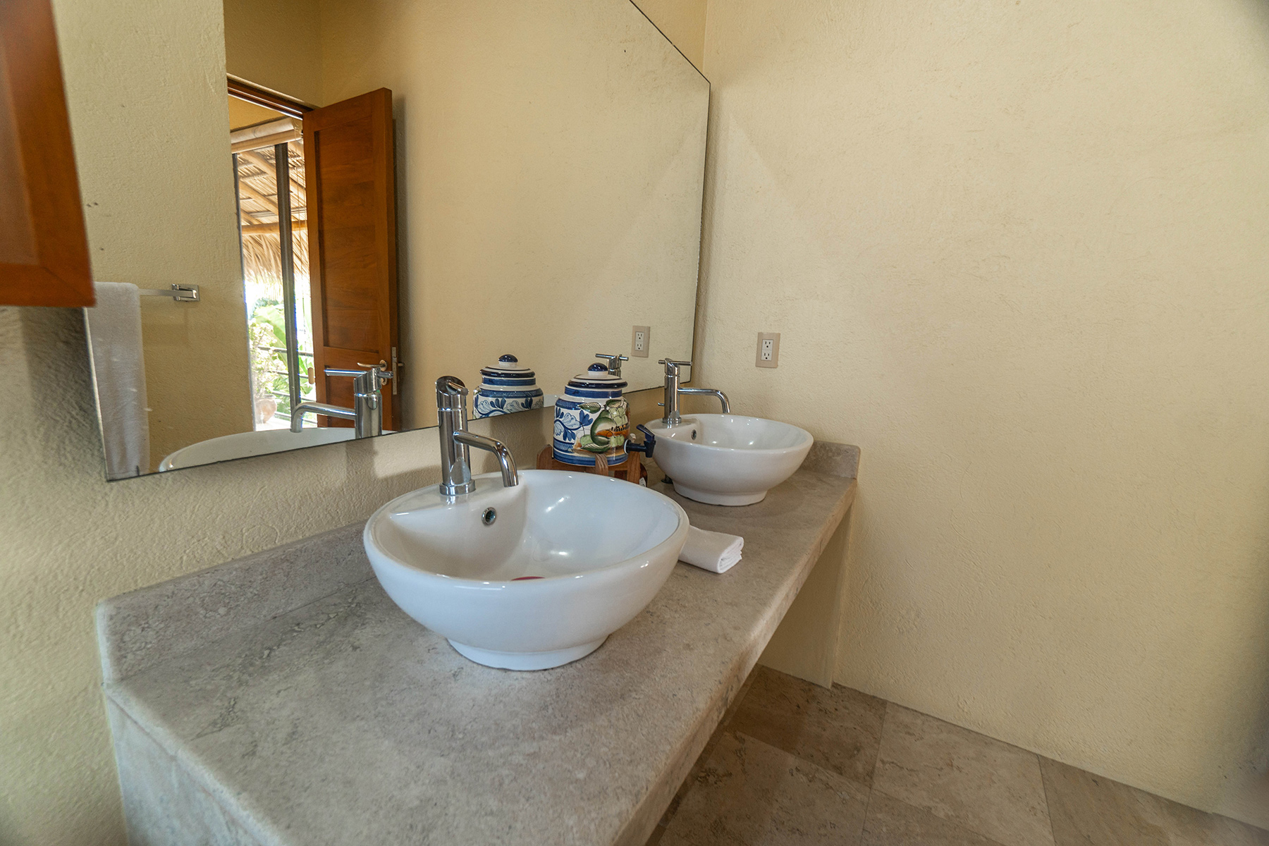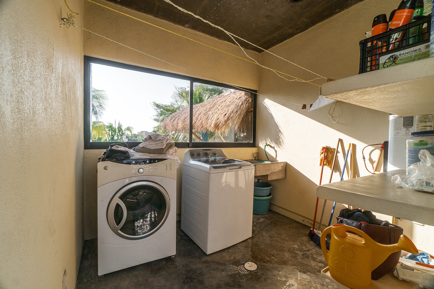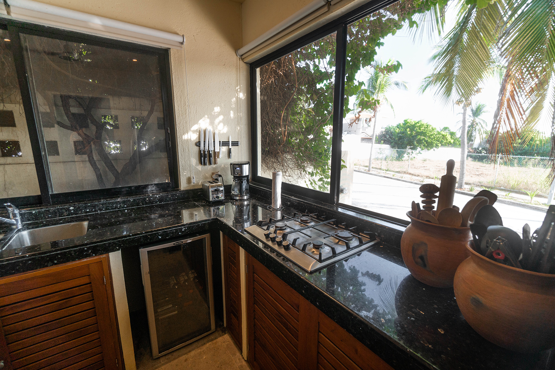 This is a three-storey house with rooftop palapa. There are two air conditioned bedrooms each with king-sized beds and large two-sink ensuites. Each bedroom has private balconies. The gourmet kitchen is fully equipped with granite counter tops, wine fridge and all the appliances a discerning chef requires. The large laundry room has a full-sized washer and dryer. A Weber gas barbeque awaits your party. All linens and towels are top quality. Three hammocks strategically located throughout the house assure a fabulous siesta.